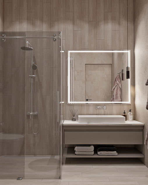 Дизайн-проект квартиры-студии для прекрасной пары. В данном проекте нам удалось разместить множество функциональных зон на маленькой площади, а именно: большой кухонный гарнитур с СВЧ. духовым шкафом, котлом, посудомоечной машиной и барной стойкой; обеденную зону; зону отдыха с креслом-коконом и фитостеной. В данной зоне можно заметить окно с подсветкой, которое выходит в прихожую. За счет него мы добились дополнительного света, так как основной дневной свет находится в спальне, за стеклянной перегородкой.